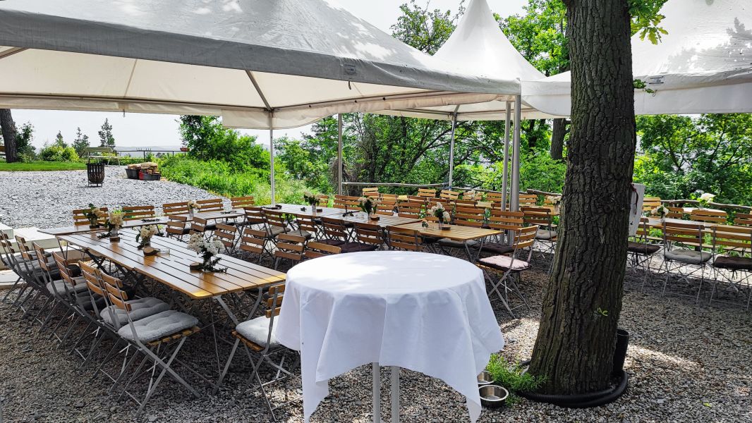 Überdachung: Ein Teil unseres Biergartens ist mit einem Pavillon überdacht, der Schutz vor Sonne und leichtem Regen bietet. So können Sie Ihren Aufenthalt im Freien in jeder Wetterlage genießen.