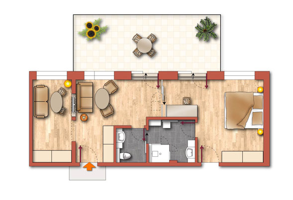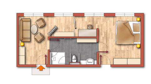 Eins unserer Familienzimmer ist für bis zu vier Personen ausgelegt und bietet ausreichend Platz für Komfort und Privatsphäre. Durch zwei separate Zugänge können die Räume unabhängig voneinander betreten werden, sodass sich niemand gestört fühlt. Das Badezimmer ist ebenfalls von beiden Bereichen aus zugänglich. Hier können Sie Ihren Aufenthalt in vollen Zügen genießen und sich wie zu Hause fühlen.